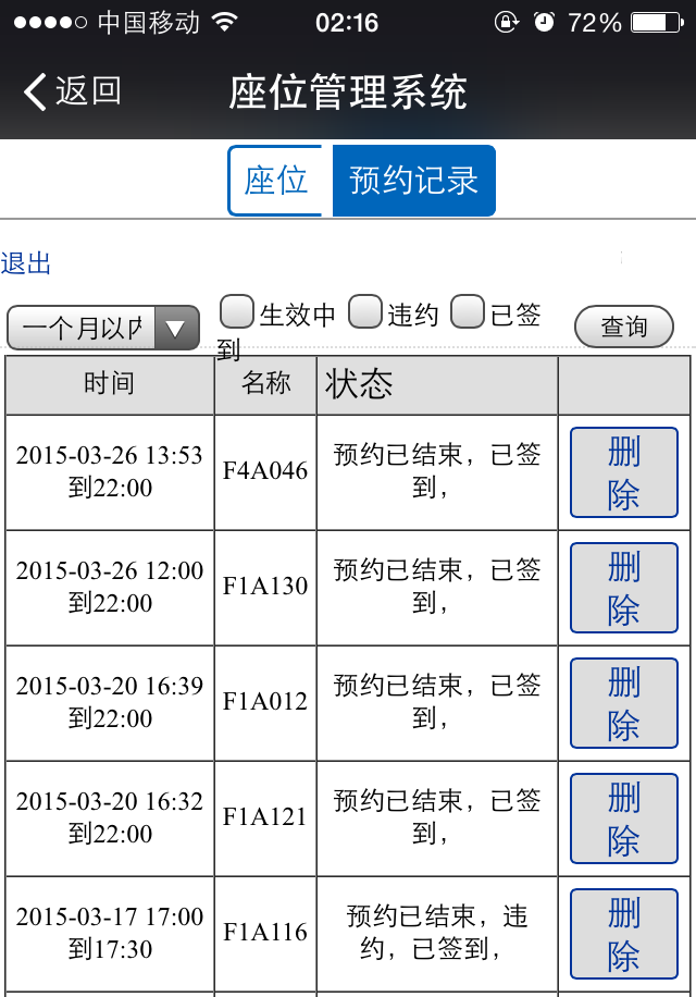 可在預約WEB預約界面實(shí)時(shí)查看每個(gè)座位的使用情況,如全天空閑、75%空閑、50%空閑、25%空閑、已占用等,點(diǎn)擊顯示空閑的座位,即可完成座位的預約,預約成功后,可在個(gè)人中心查看已預約的座位記錄,在預約時(shí)段未到預約未生效之前,可進(jìn)行刪除、修改等操作,如下圖所示: