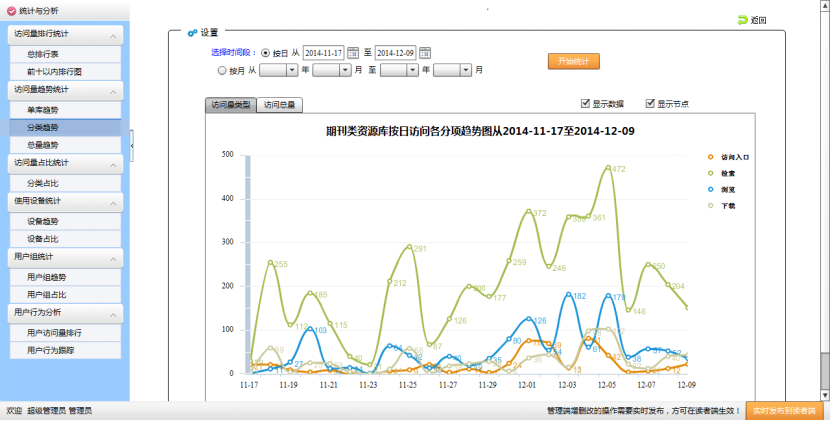 趨勢統計重點(diǎn)表現資源庫訪(fǎng)問(wèn)量隨時(shí)間周期的趨勢走勢,目前分為三種統計圖表:?jiǎn)螏熠厔輬D、分類(lèi)趨勢圖和總量趨勢圖。